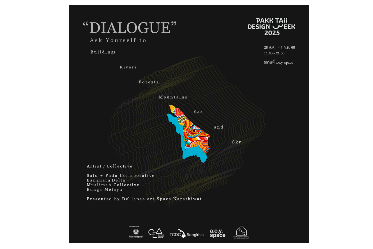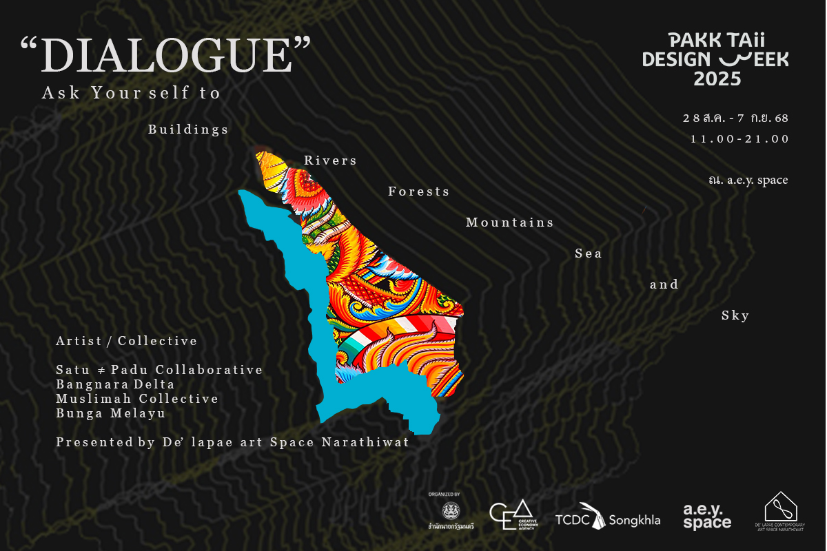 นิทรรศการ บทสนทนา ร่วมสำรวจตัวตน ผ่าน อาคาร แม่น้ำ เรือ ต้นไป ภูเขา ทะเล และ ท้องฟ้า เป็นส่วนหนึ่งในการขับเคลื่อนและพัฒนาชุมชนโดยเป็นการต่อยอดทุนทางวัฒนธรรมจากภูมิปัญญาท้องถิ่นที่ห้วนระลึกถึง และ ก้าวไปจากการบอกเล่าและสะท้อนภาพของจังหวัดนราธิวาสออกไป จากกลุ่มศิลปินที่ แสดงภาพลักษณะและขับเคลื่อนเมืองให้ก้าวไปอย่างยั่งยืน
